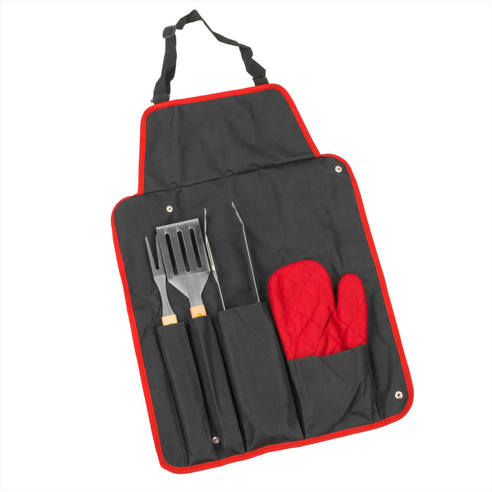 • Dimensions - Set includes - 39.5cm Spatula, 38.5cm Fork, 37.5cm Tongs, 25cm Oven Glove, 1x Apron