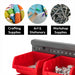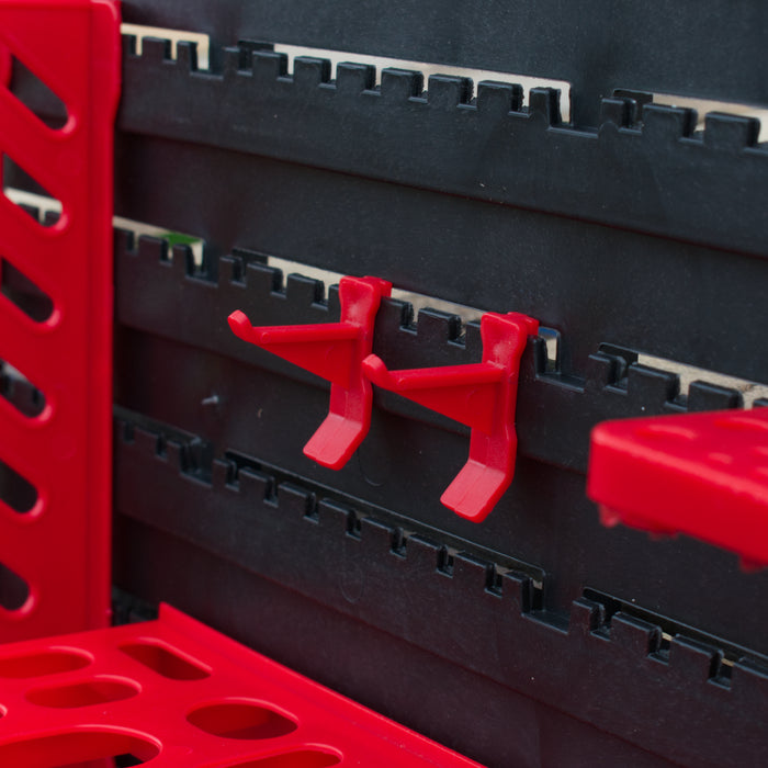 The ultimate combination of storage bin organisation and tool storage space, this 72 piece kit comes with 6 wall mountable panels, 28x storage bins in 2 sizes. The 28 larger black bins allow for bigger items to be stored such as small tools and spare parts, where as the 24 smaller red bins are perfect for keeping those tiny screws and fittings safe. Also included is 1 medium attachable tool holder, 1 small attachable tool holder, 2 attachable eight-tier hanging racks, and 10 attachable hooks.