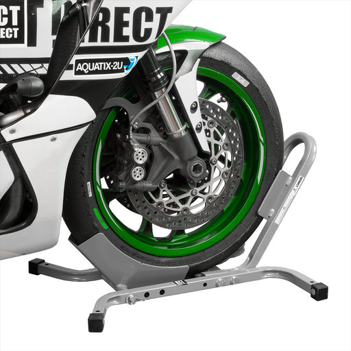 The KCT Motorcycle Front Paddock Lift Stand features dual fork cradles that fit snugly beneath your bike’s front wheel forks, offering a stable hea...