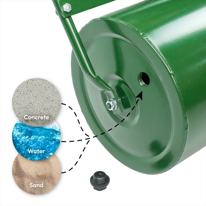 - Easy to Fill - The roller barrel can be easily filled with sand or water by way of the small plug hole in the barrel to create the weight needed. The side of the drum has a plug that can be removed to refill the barrel.