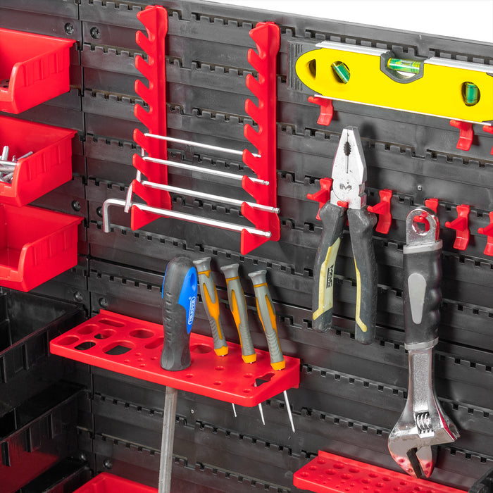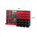 - Dimensions - Panels: 4 Individual Panel Dimensions: 47.5 x 27.5cm Storage Bins: 28 (x12 large black, x16 small red) Accessories: x1 medium tool holder, x1 small tool holder, x2 eight-tier hanging racks, x10 hooks