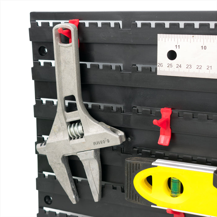 Includes 4 wall mountable panels with holding accessories and 2 attachable tool shelves allowing you to hang tools and equipment, each tool shelf has 57 individual slots which makes a total of 114 slots allowing you to hold screwdrivers, hammers, spanners, and other heavy duty items. 48 hanging hooks are also included so that you can hang an array of tools on your board. All of the accessories can be easily attached to the board using the rigged slots.