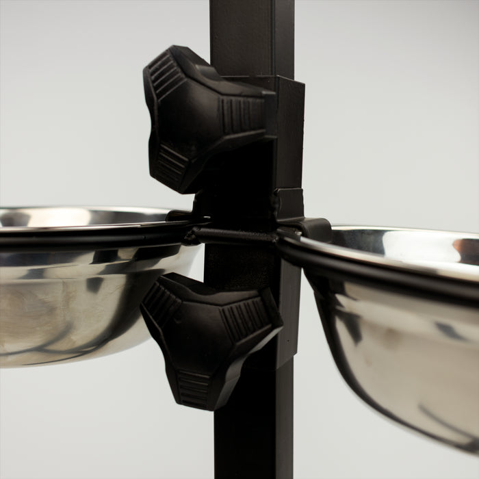 The 2 deep bowls are housed in a twin holder that can be easily adjusted up or down to suit the height thats best for your pet. Each bowl can hold either water or food and can be easily removed from the holder for filling or cleaning.