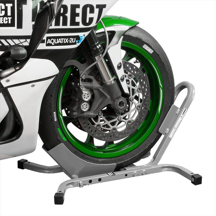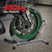 Featuring a non-slip base, it prevents unwanted movement, enhancing safety and ease of use. Its versatile, user-friendly design allows for quick setup and accommodates a variety of motorbike wheel sizes.