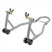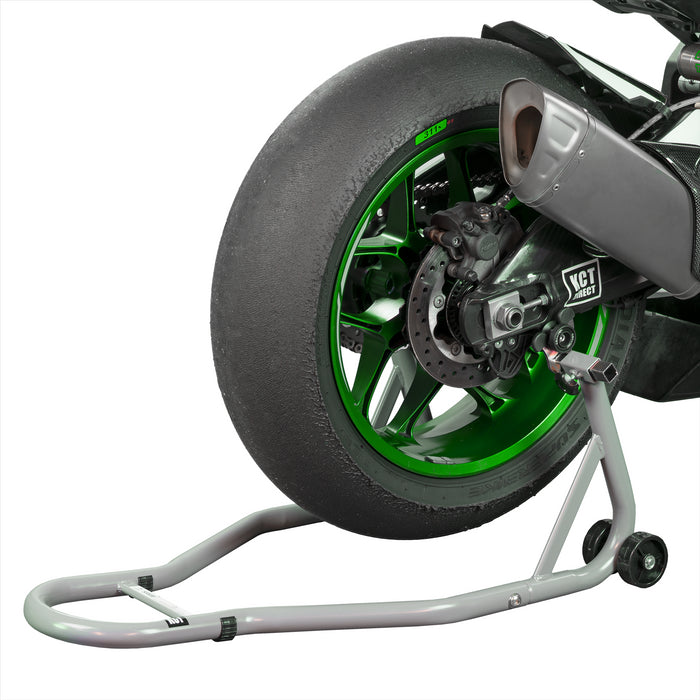- Rear Lift Stand with Spool Cradles - The motorcycle stand includes two sturdy spool cradles that fit snugly beneath your bike's swing arm spools, providing a stable lifting solution for various maintenance tasks. The cradles "scoop" underneath the spools, holding the bike securely in place while lifted.