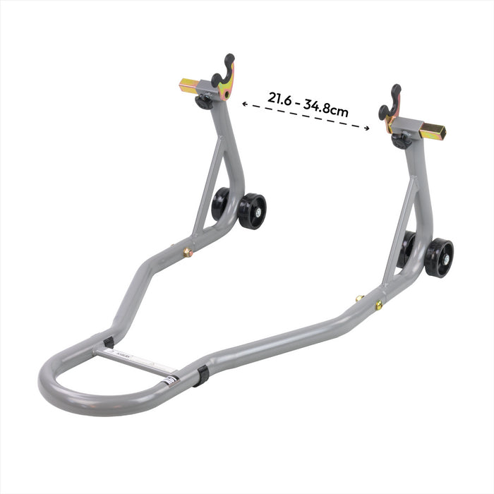 The KCT Motorcycle Rear Lift Stand - Spool Cradles rear lift stand comes equipped with dual spool cradles that fit beneath your bike's swing arm spools, providing a secure lift. It is highly adjustable, with a set screw on each cradle shank allowing precise width adjustments from 21.6cm to 34.8cm to fit various bike sizes. This stand provides a heavy duty stable lift, facilitating tasks such as chain maintenance, wheel cleaning, or tire changes.