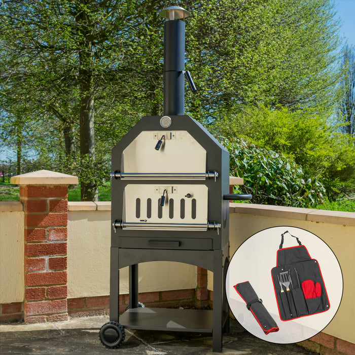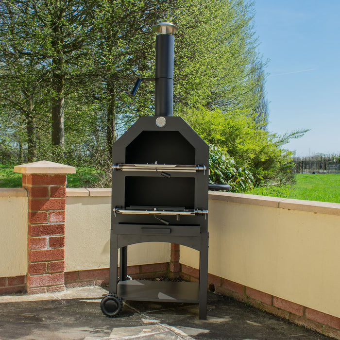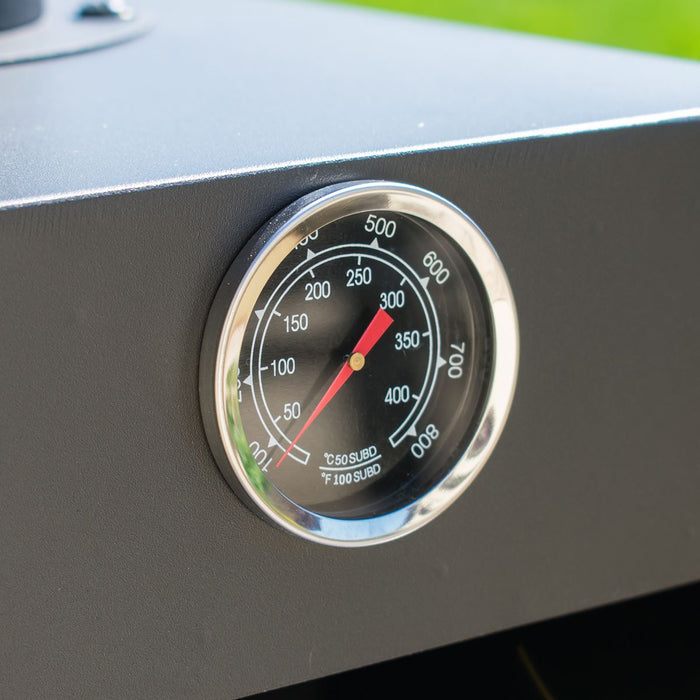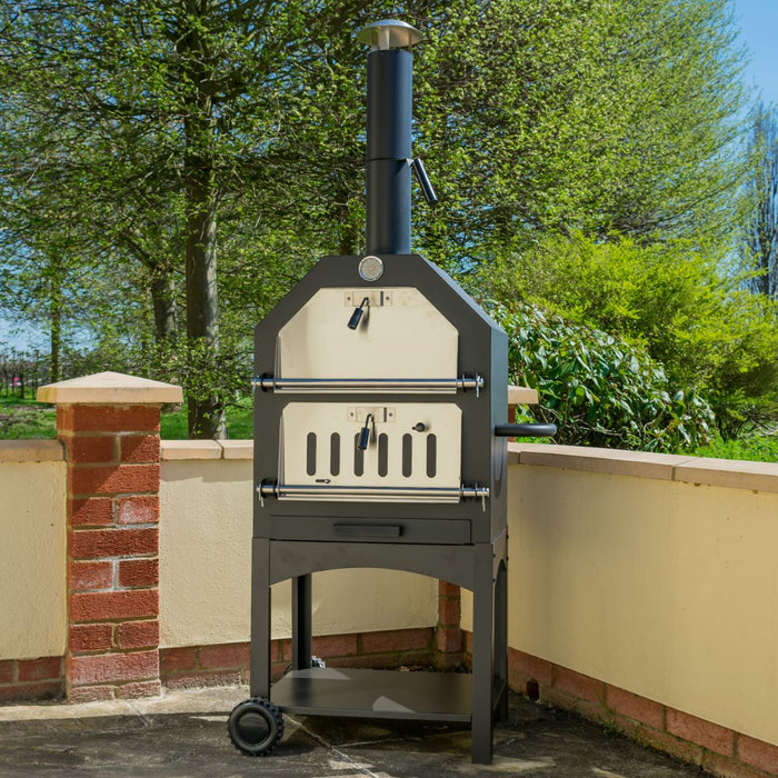 - Essential Features - The pizza oven includes an inbuilt thermometer to monitor the heat inside and a removable ash tray that helps when cleaning the oven. A lower shelf has space for tools and a handle and wheels ensures the oven can be easily moved.