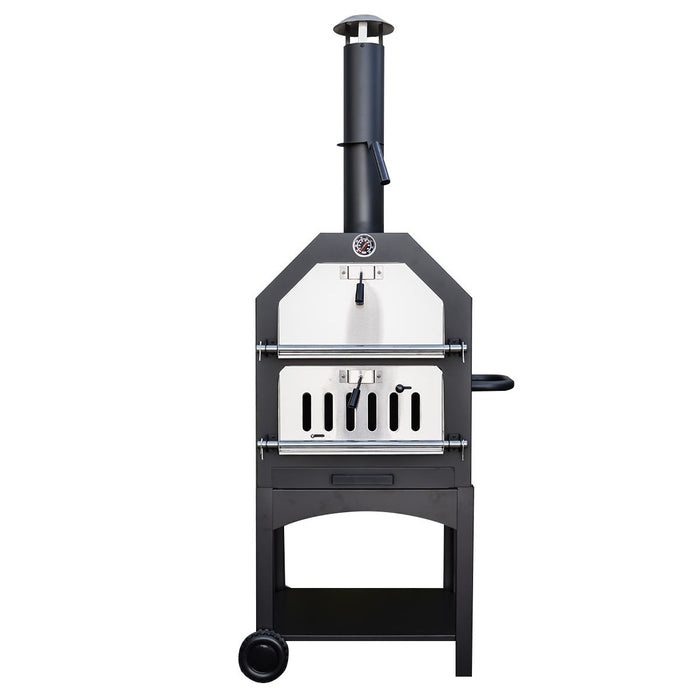 - Generous Cooking Space- The pizza grill has a top level that has a generous cooking space for baking a pizza on the included stone, smoking or cooking various meats and veg and a lower section with space for charcoal or untreated wood fuel