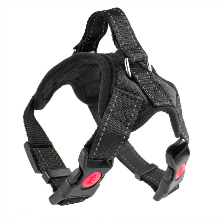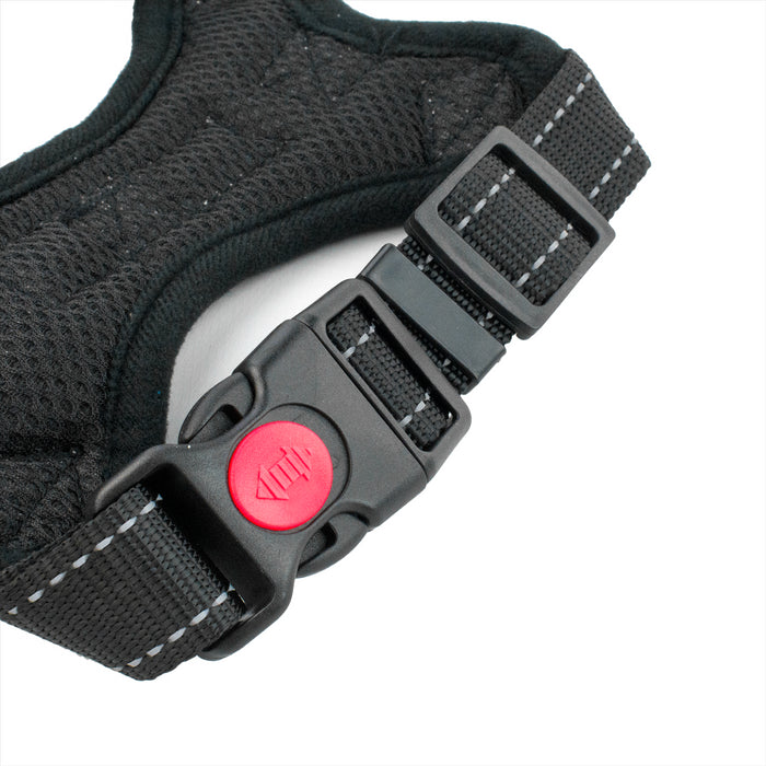 The buckle clip on the strap has a lockable feature to prevent it from accidentally becoming undone while the harness is on your pet, and the padding material on the majority of the harness is breathable and comfortable.
